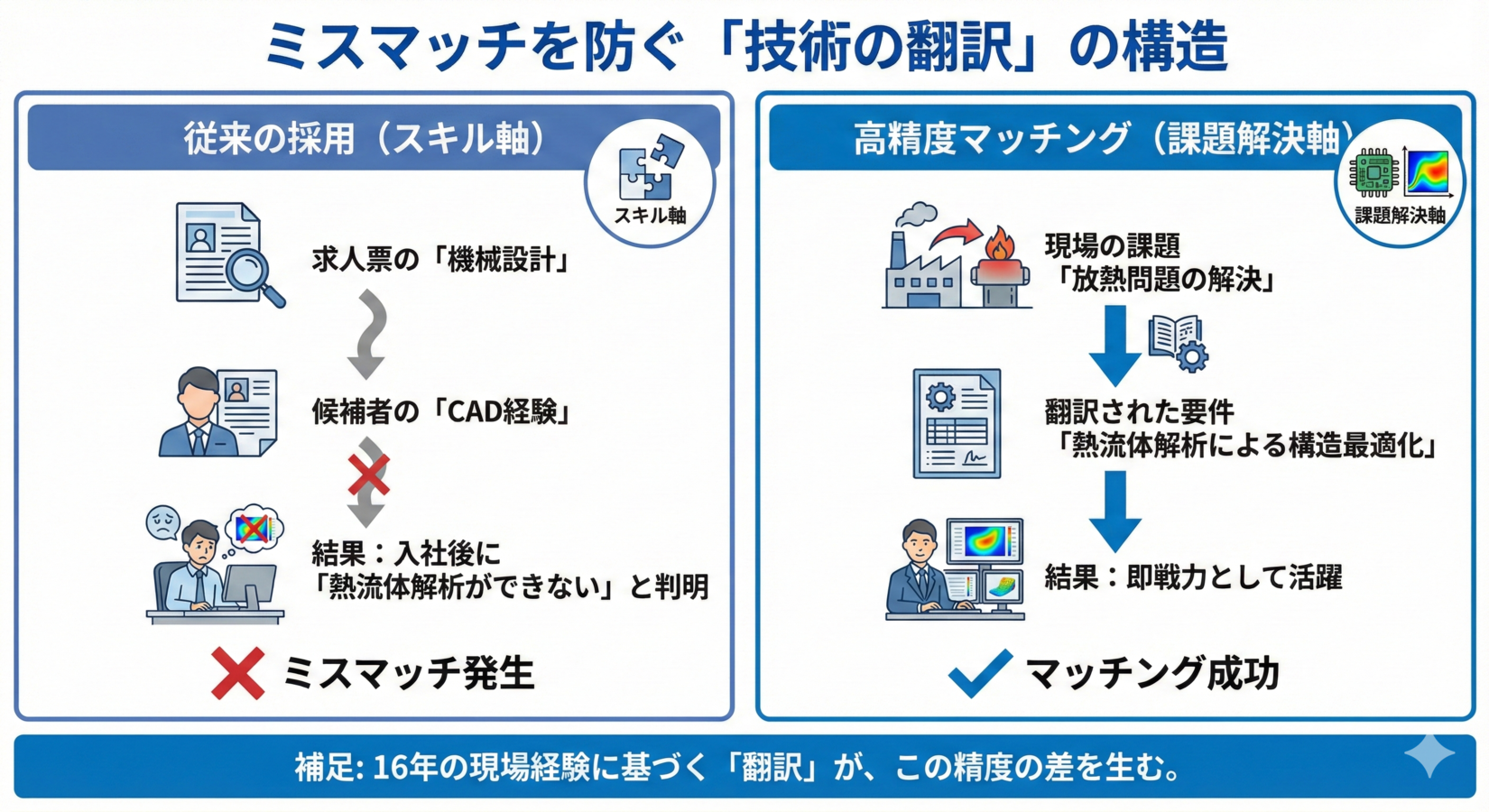 当編集部では、多くの製造業スタートアップの採用現場を見てきましたが、ミスマッチの根本原因は「技術の翻訳不足」に集約されます。本記事では、16年の現場経験を持つ元・半導体プロセスエンジニアの視点から、現場エンジニアが納得し、採用担当者様が自信を持って推薦できる「高精度なマッチング手法」を具体的に解説します。