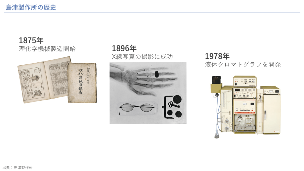 1875年に創業者の島津源蔵が、理化学機器の製造を開始したことが始まりです。仏具のかざり職人として培った手先の器用さで、小学校向けなどにフラスコやビーカー、人体模型などを作っていました。