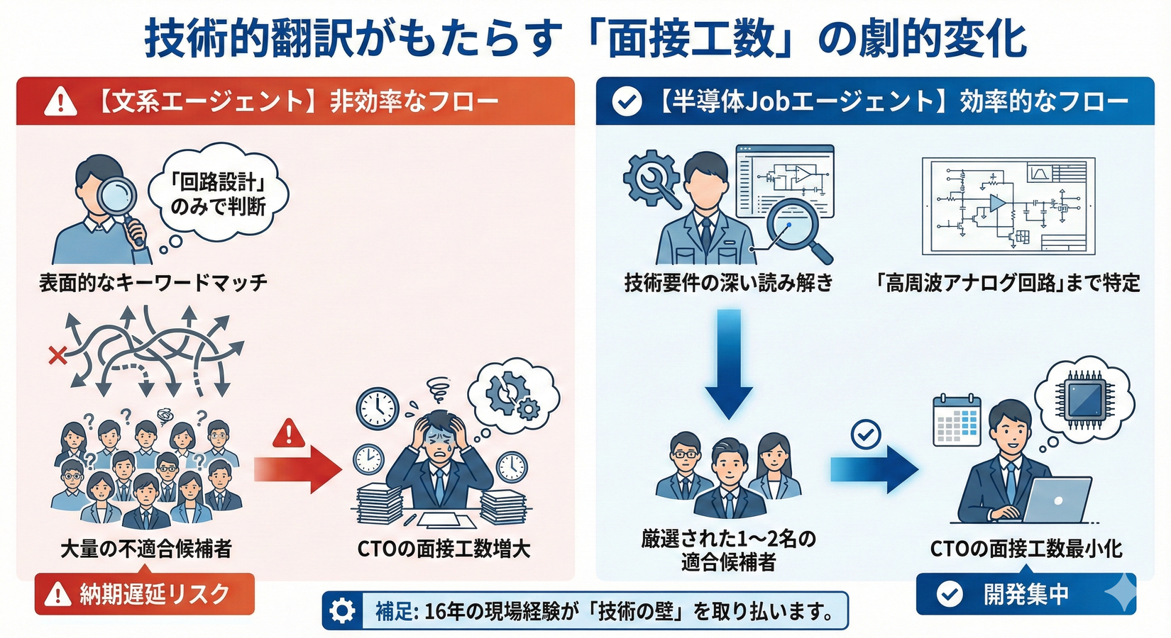 この16年のエンジニア経験に基づく技術要件の深い読み解きは、ミスマッチ解消に直結します。 私たちが候補者と対話する際は、デバイスの構造やプロセスフロー、あるいは電気回路の設計思想といった「現場の言葉」を共通言語として使用します。これにより、候補者の技術レベルを面接前に当編集部が厳密に評価できるため、CTOが面接で「技術レベルが足りない」と落胆する確率を極限まで下げることが可能です。